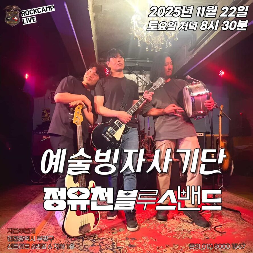 예술빙자사기단 X 정유천블루스밴드 공연2025-11-22토요일 저녁 8시 30부평 락캠프인천 부평구 신트리로6번길 6 지하1층 ( 부평구청역 5번 출구) https://www.instagram.com/rockcamp_live