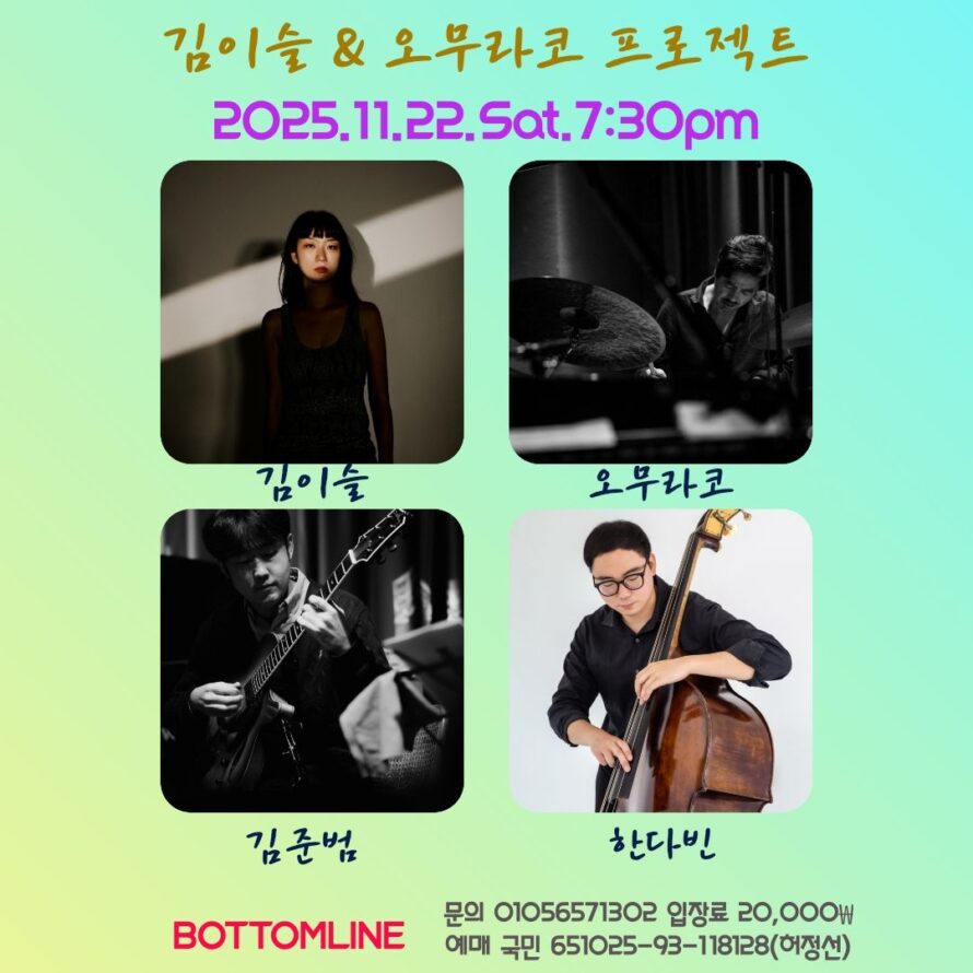 버텀라인 토요일 공연팀 알립니다.탱고그룹 “리베로시스”의 리더로 버텀라인 공연시 많은 호응을 얻은 재즈 피아니스트 김이슬. 지금은 뉴욕에서 활동중인데요 이번엔 일본 도쿄 출신의 드러머 오무라 코와